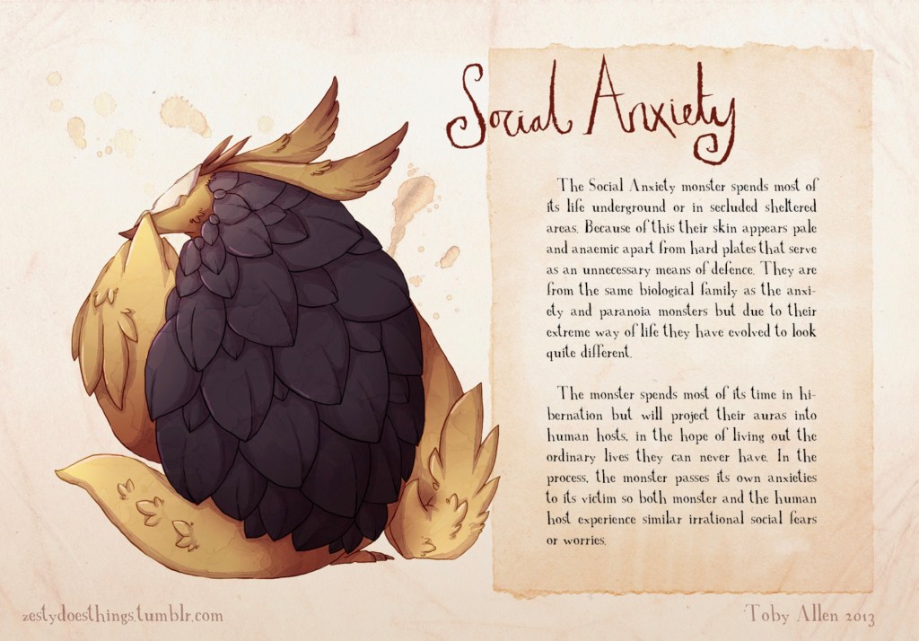 - Marked fear or anxiety about one or more social situations in which the individual is exposed to possible scrutiny by others. Examples include social interactions (e.g., having a conversation, meeting unfamiliar people), being observed (e.g., eating or drinking), and performing in front of others (e.g., giving a speech).